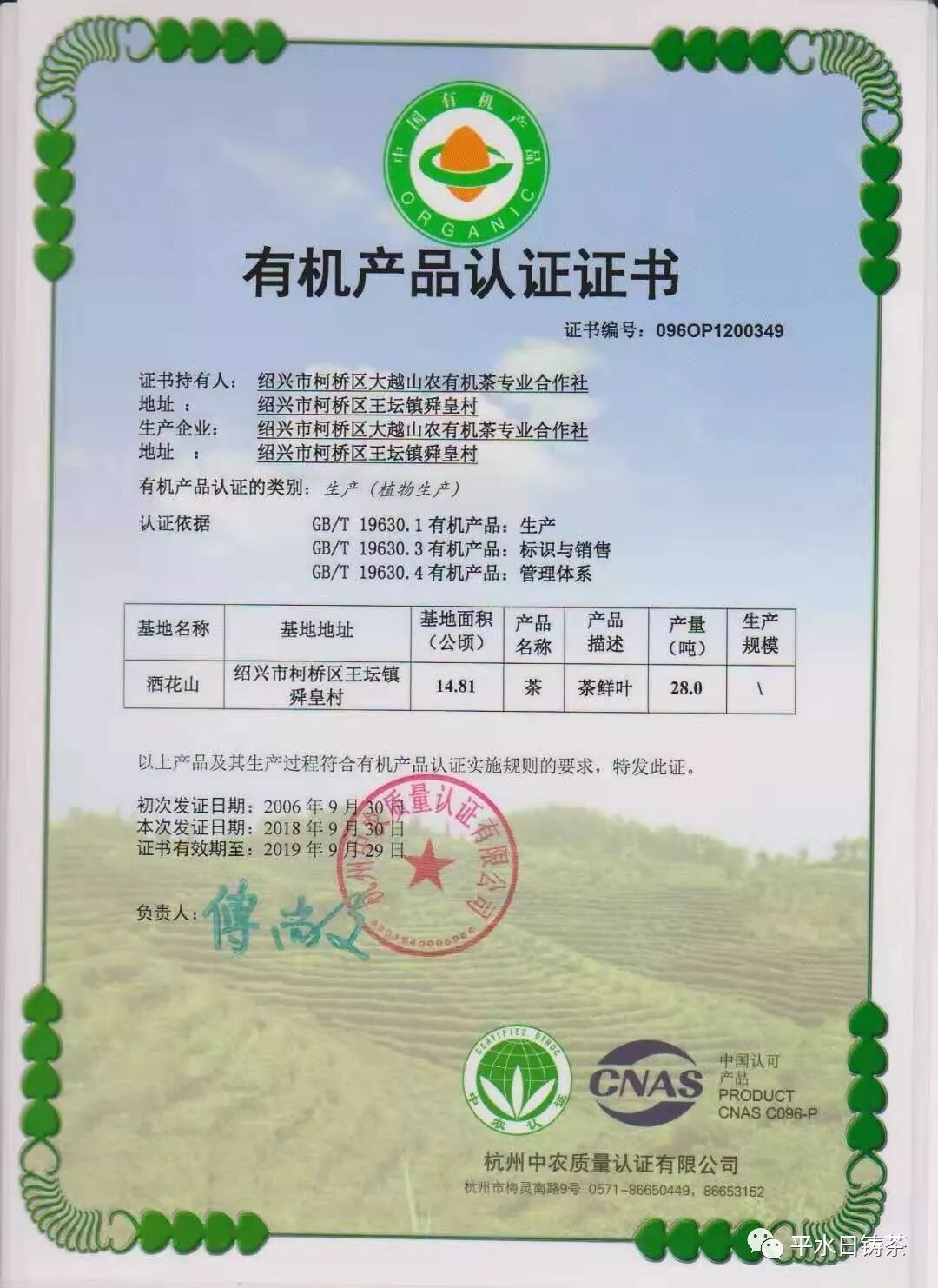 目前,公司主导产品为“大越山龙”牌有机龙井茶、有机日铸茶,依托多年的市场信誉和品质保证,在上海和绍兴等地斩获了众多忠实客户;2018年,公司还在上海中天科技城开设了“平水日铸”专卖店,让更多的消费者品鉴到来自柯桥区的有机茶。